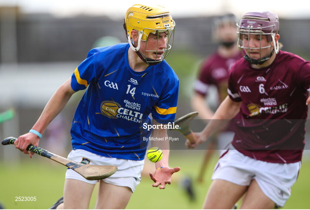 27 May 2023; Cormac Fitzpatrick of Tipperary in action against Cathal Sweeney of Galway during the GAA Celtic Challenge Cup Finals match between Galway and Tipperary at St Brendan’s Park in Birr, Offaly. Photo by Michael P Ryan/Sportsfile