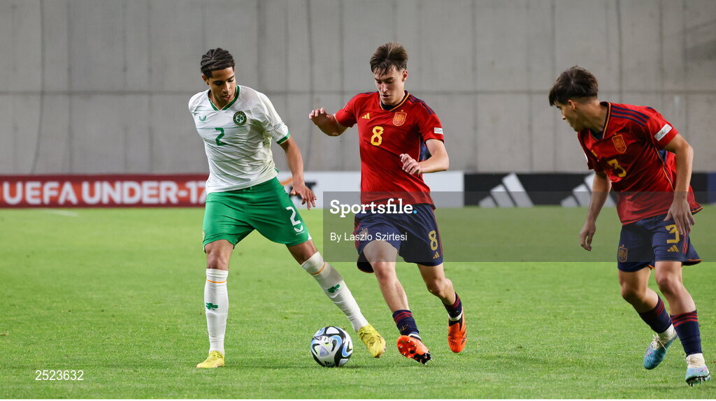 27 May 2023; Daniel Babb of Republic of Ireland in action against Javier Fernández González and Daniel Munoz Navas of Spain during the UEFA European U17 Championship Quarter-Final match between Spain and Republic of Ireland at Hidegkuti Hándor Stadium in Budapest, Hungary. Photo by Laszlo Szirtesi/Sportsfile