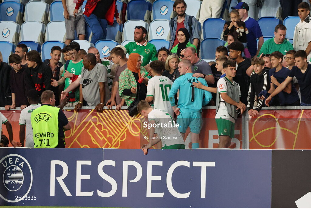 27 May 2023; Republic of Ireland players meet their families and friends after the UEFA European U17 Championship Quarter-Final match between Spain and Republic of Ireland at Hidegkuti Hándor Stadium in Budapest, Hungary. Photo by Laszlo Szirtesi/Sportsfile