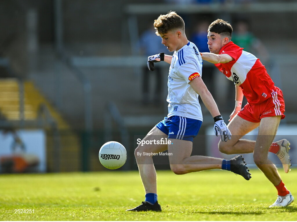 28 May 2023; Tommy Mallen of Monaghan shoots to score his side's first goal during the Electric Ireland Ulster Minor GAA Football Championship Final match between Derry and Monaghan at Box-It Athletic Grounds in Armagh. Photo by Stephen Marken/Sportsfile