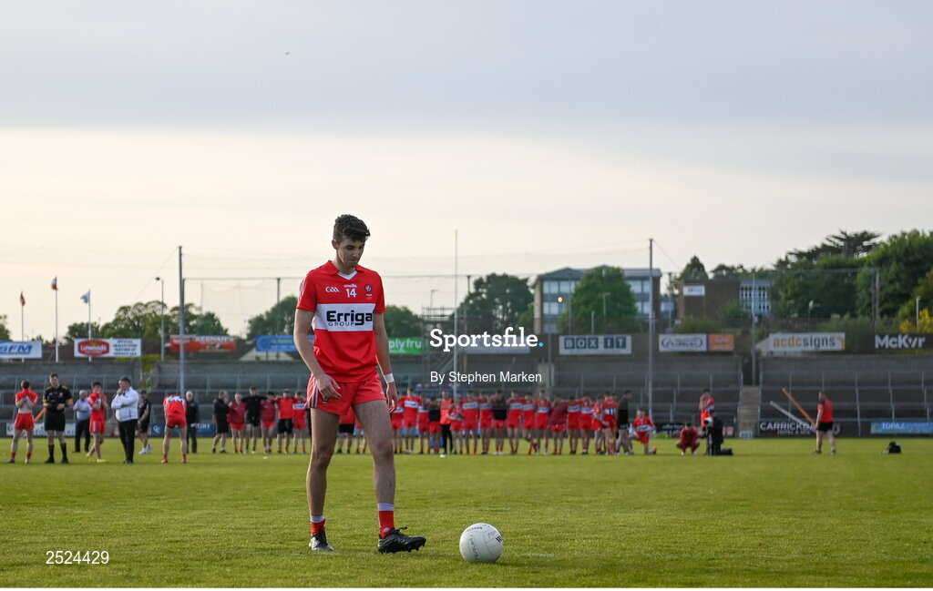 28 May 2023; Conall Higgns of Derry collects the ball before taking the winning penalty in the shootout to decide the Electric Ireland Ulster Minor GAA Football Championship Final match between Derry and Monaghan at Box-It Athletic Grounds in Armagh. Photo by Stephen Marken/Sportsfile