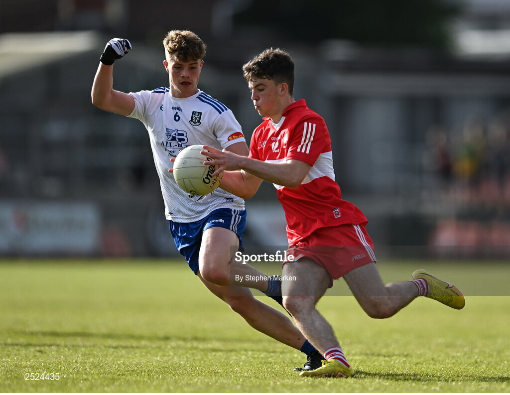 28 May 2023; Johnny McGuckia of Derry in action against Tommy Mallen of Monaghan during the Electric Ireland Ulster Minor GAA Football Championship Final match between Derry and Monaghan at Box-It Athletic Grounds in Armagh. Photo by Stephen Marken/Sportsfile