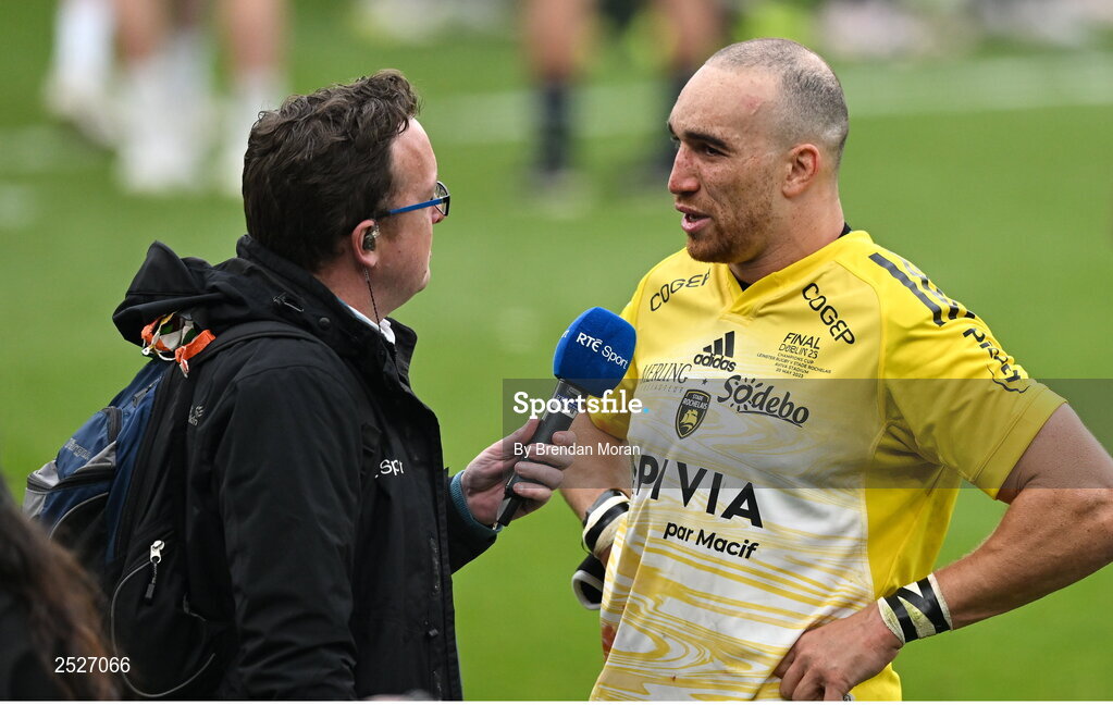 20 May 2023; Ultan Dillane of La Rochelle is interviewed by Damien O'Meara of RTE after the Heineken Champions Cup Final match between Leinster and La Rochelle at Aviva Stadium in Dublin. Photo by Brendan Moran/Sportsfile