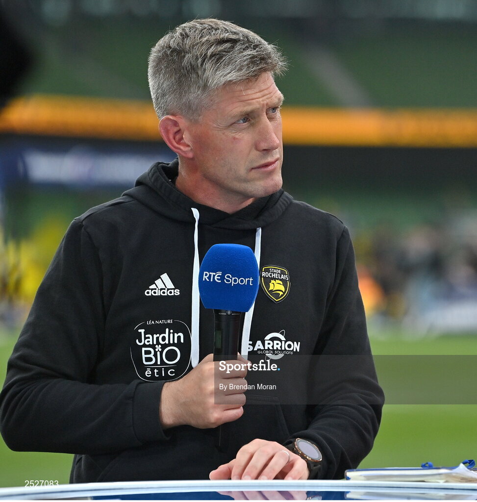 20 May 2023; La Rochelle head coach Ronan O'Gara is interviewed by RTE televsion before the Heineken Champions Cup Final match between Leinster and La Rochelle at Aviva Stadium in Dublin. Photo by Brendan Moran/Sportsfile