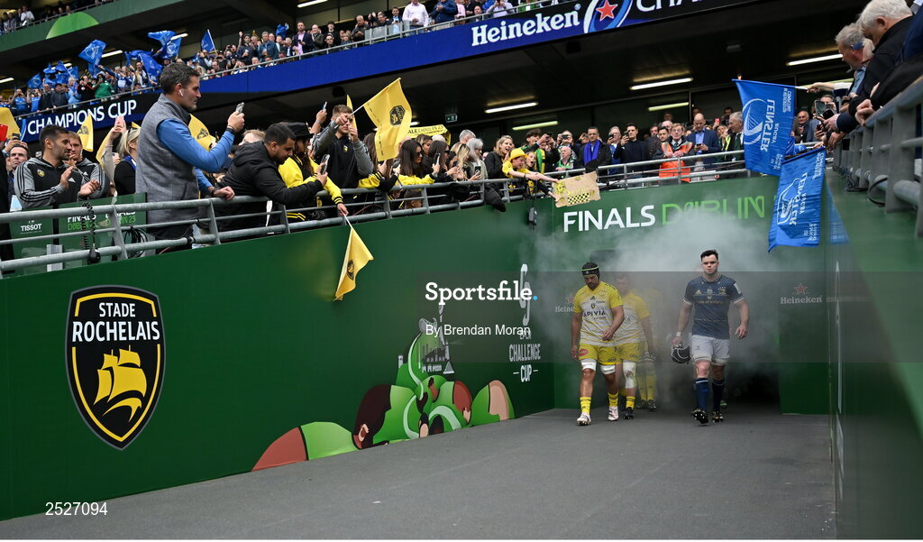 20 May 2023; Team captains Grégory Alldritt of La Rochelle and James Ryan of Leinster lead their teams onto the pitch before the Heineken Champions Cup Final match between Leinster and La Rochelle at Aviva Stadium in Dublin. Photo by Brendan Moran/Sportsfile