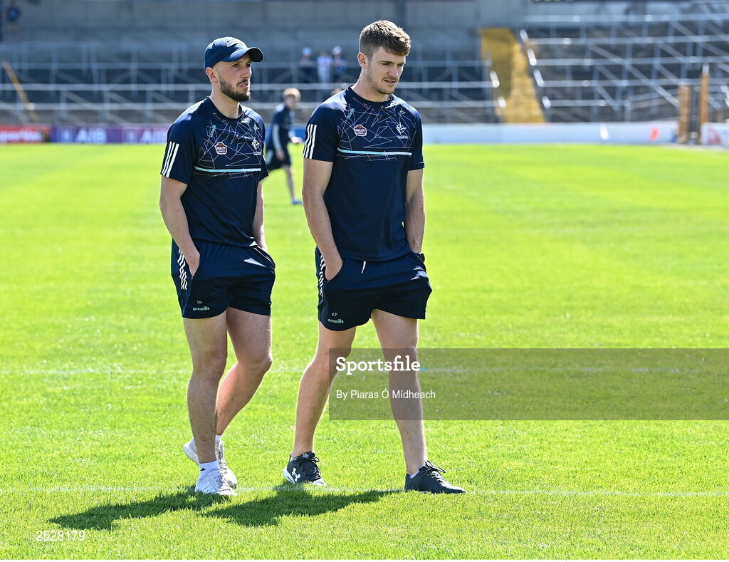 3 June 2023; Kildare players Neil Flynn, left, and Kevin Feely walk the pitch before the GAA Football All-Ireland Senior Championship Round 2 match between Kildare and Dublin at UPMC Nowlan Park in Kilkenny. Photo by Piaras Ó Mídheach/Sportsfile