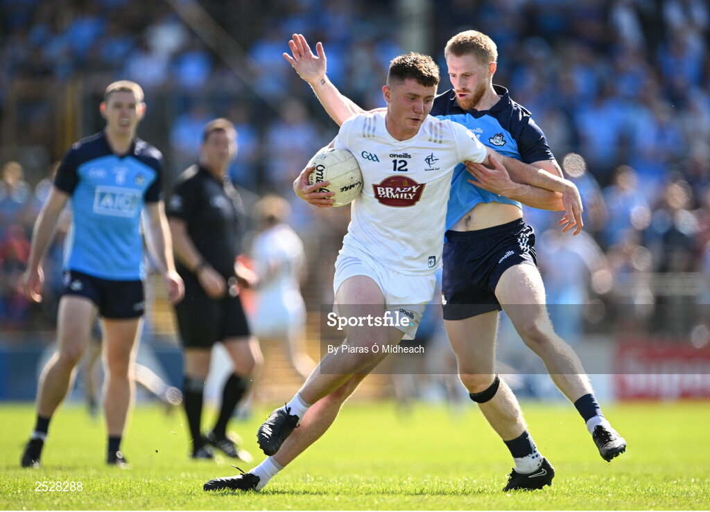 3 June 2023; Alex Beirne of Kildare in action against Killian O'Gara of Dublin during the GAA Football All-Ireland Senior Championship Round 2 match between Kildare and Dublin at UPMC Nowlan Park in Kilkenny. Photo by Piaras Ó Mídheach/Sportsfile