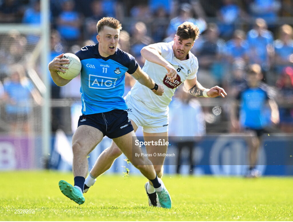 3 June 2023; Seán Bugler of Dublin in action against Kevin O'Callaghan of Kildare during the GAA Football All-Ireland Senior Championship Round 2 match between Kildare and Dublin at UPMC Nowlan Park in Kilkenny. Photo by Piaras Ó Mídheach/Sportsfile