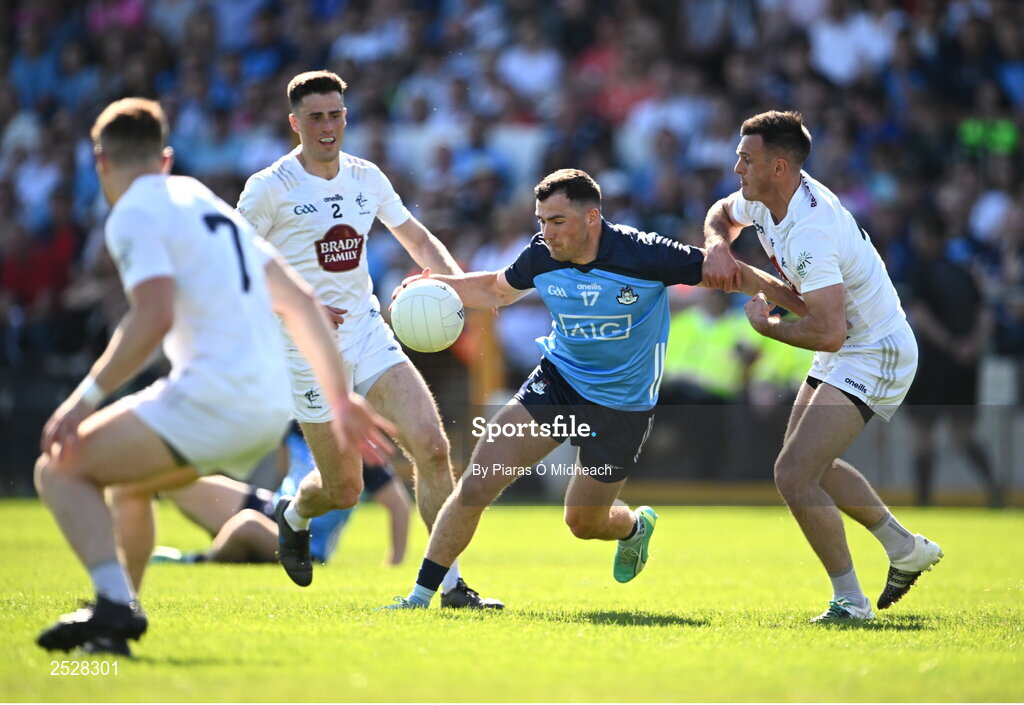 3 June 2023; Colm Basquel of Dublin is tackled by Eoin Doyle of Kildare during the GAA Football All-Ireland Senior Championship Round 2 match between Kildare and Dublin at UPMC Nowlan Park in Kilkenny. Photo by Piaras Ó Mídheach/Sportsfile