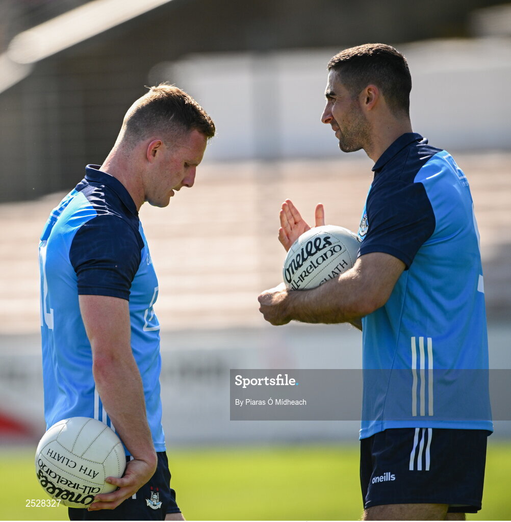 3 June 2023; Ciarán Kilkenny of Dublin, left, alongside teammate James McCarthy before the GAA Football All-Ireland Senior Championship Round 2 match between Kildare and Dublin at UPMC Nowlan Park in Kilkenny. Photo by Piaras Ó Mídheach/Sportsfile