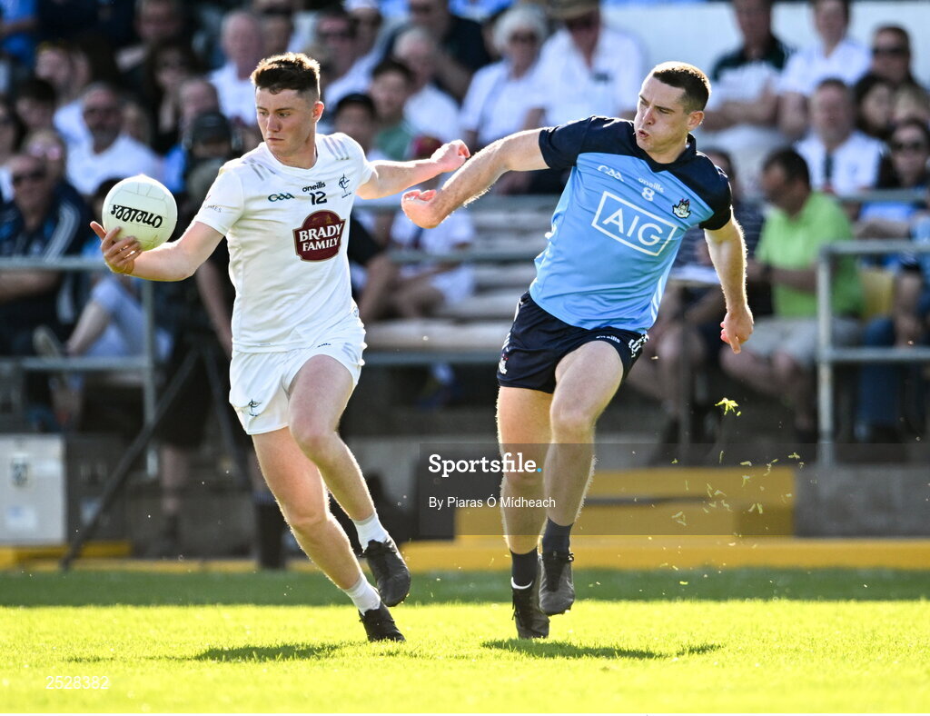 3 June 2023; Alex Beirne of Kildare in action against Brian Fenton of Dublin during the GAA Football All-Ireland Senior Championship Round 2 match between Kildare and Dublin at UPMC Nowlan Park in Kilkenny. Photo by Piaras Ó Mídheach/Sportsfile