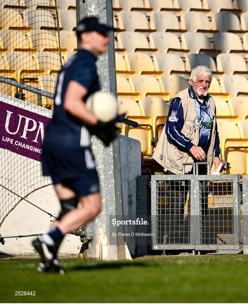 3 June 2023; Dublin supporter Gerry "Dublin Gerry" Gowran watches as Dublin goalkeeper Stephen Cluxton prepares to take a kick-out during the GAA Football All-Ireland Senior Championship Round 2 match between Kildare and Dublin at UPMC Nowlan Park in Kilkenny. Photo by Piaras Ó Mídheach/Sportsfile