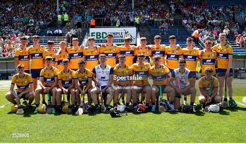 4 June 2023; The Clare panel before during the Electric Ireland GAA Hurling All-Ireland Minor Championship Final match between Clare and Galway at FBD Semple Stadium in Thurles, Tipperary. Photo by Michael P Ryan/Sportsfile
