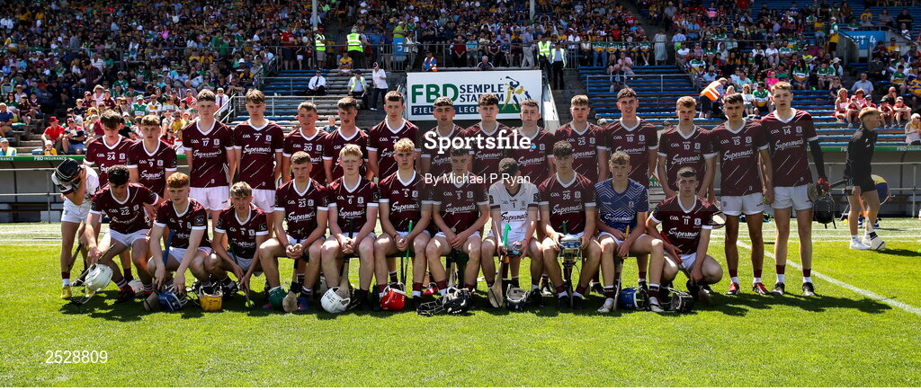 4 June 2023; The Galway panel before the Electric Ireland GAA Hurling All-Ireland Minor Championship Final match between Clare and Galway at FBD Semple Stadium in Thurles, Tipperary. Photo by Michael P Ryan/Sportsfile