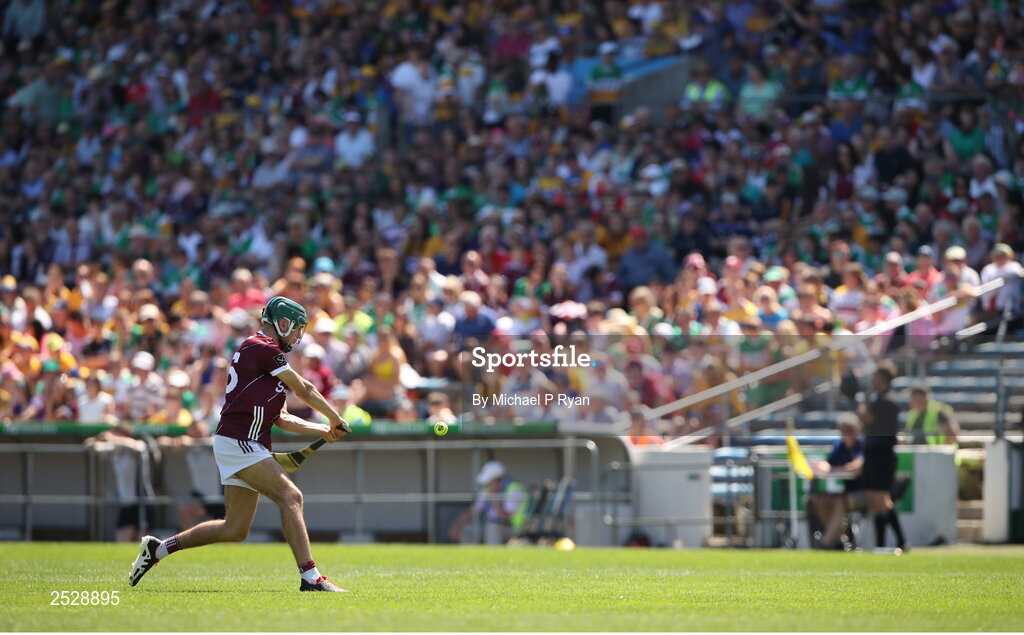4 June 2023; Aaron Niland of Galway takes a free during the Electric Ireland GAA Hurling All-Ireland Minor Championship Final match between Clare and Galway at FBD Semple Stadium in Thurles, Tipperary. Photo by Michael P Ryan/Sportsfile
