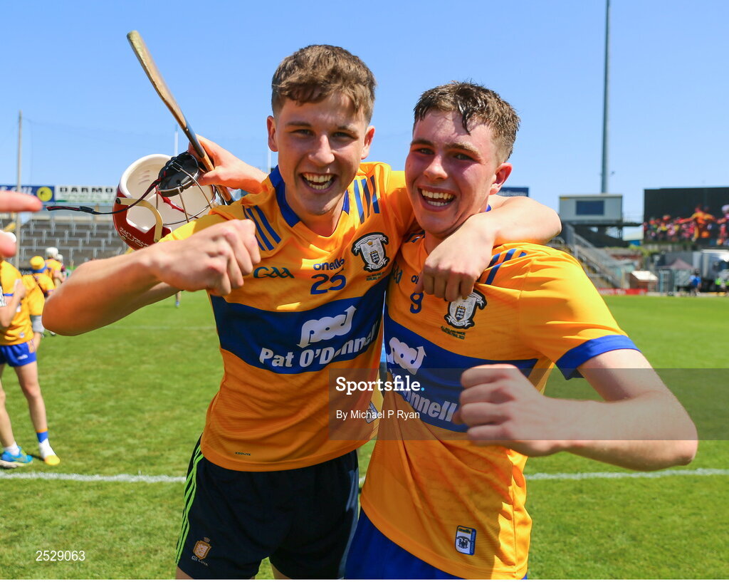 4 June 2023; Clare players Padraic O'Donovan, left, and Jack Mescal celebrate after the Electric Ireland GAA Hurling All-Ireland Minor Championship Final match between Clare and Galway at FBD Semple Stadium in Thurles, Tipperary. Photo by Michael P Ryan/Sportsfile