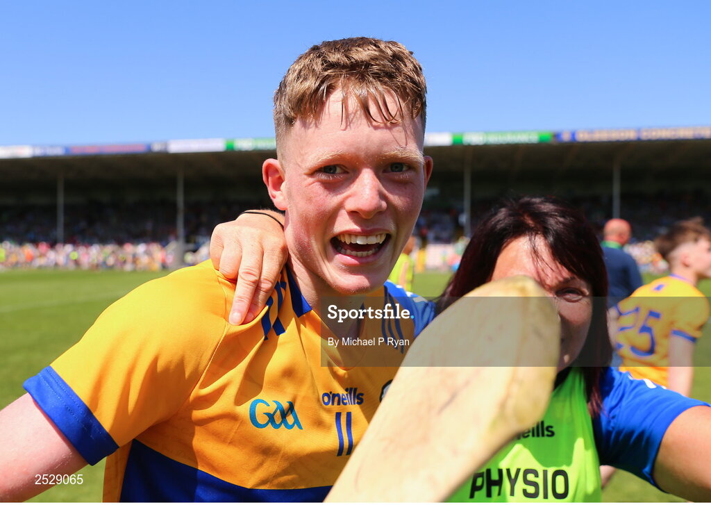 14 June 2023; Michael Collins of Clare celebrates after the Electric Ireland GAA Hurling All-Ireland Minor Championship Final match between Clare and Galway at FBD Semple Stadium in Thurles, Tipperary. Photo by Michael P Ryan/Sportsfile