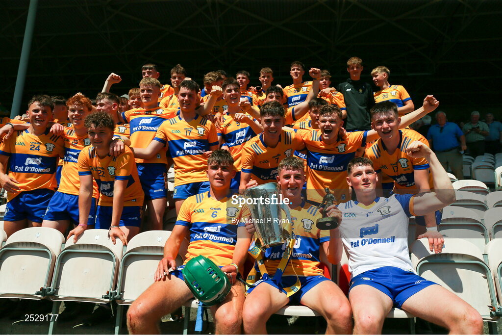 4 June 2023; Clare players celebrate after the Electric Ireland GAA Hurling All-Ireland Minor Championship Final match between Clare and Galway at FBD Semple Stadium in Thurles, Tipperary. Photo by Michael P Ryan/Sportsfile