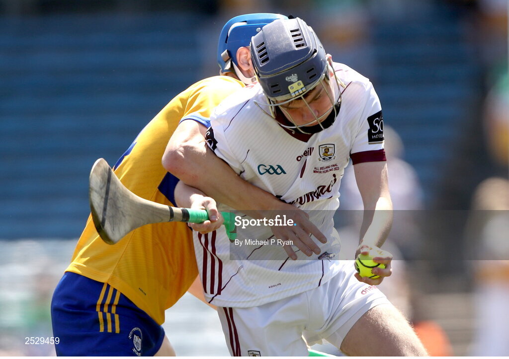 4 June 2023; Galway goalkeeper Shane Murray is tackled by Mark O'Brien of Clare during the Electric Ireland GAA Hurling All-Ireland Minor Championship Final match between Clare and Galway at FBD Semple Stadium in Thurles, Tipperary. Photo by Michael P Ryan/Sportsfile