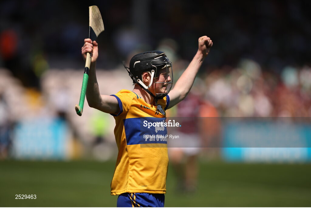 4 June 2023; Michael Collins of Clare celebrates at the final whistle after the Electric Ireland GAA Hurling All-Ireland Minor Championship Final match between Clare and Galway at FBD Semple Stadium in Thurles, Tipperary. Photo by Michael P Ryan/Sportsfile