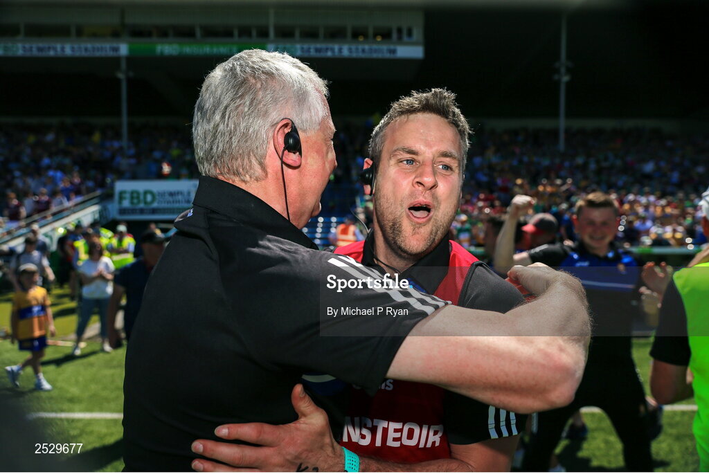 4 June 2023; Clare manager Brian O’Connell celebrates at the final whistle during the Electric Ireland GAA Hurling All-Ireland Minor Championship Final match between Clare and Galway at FBD Semple Stadium in Thurles, Tipperary. Photo by Michael P Ryan/Sportsfile