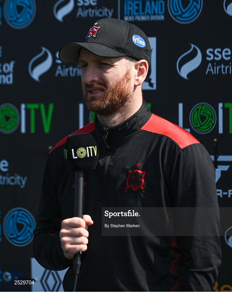 5 June 2023; Dundalk head coach Stephen O'Donnell speaks to LOI TV before the SSE Airtricity Men's Premier Division match between Dundalk and UCD at Oriel Park in Dundalk, Louth. Photo by Stephen Marken/Sportsfile