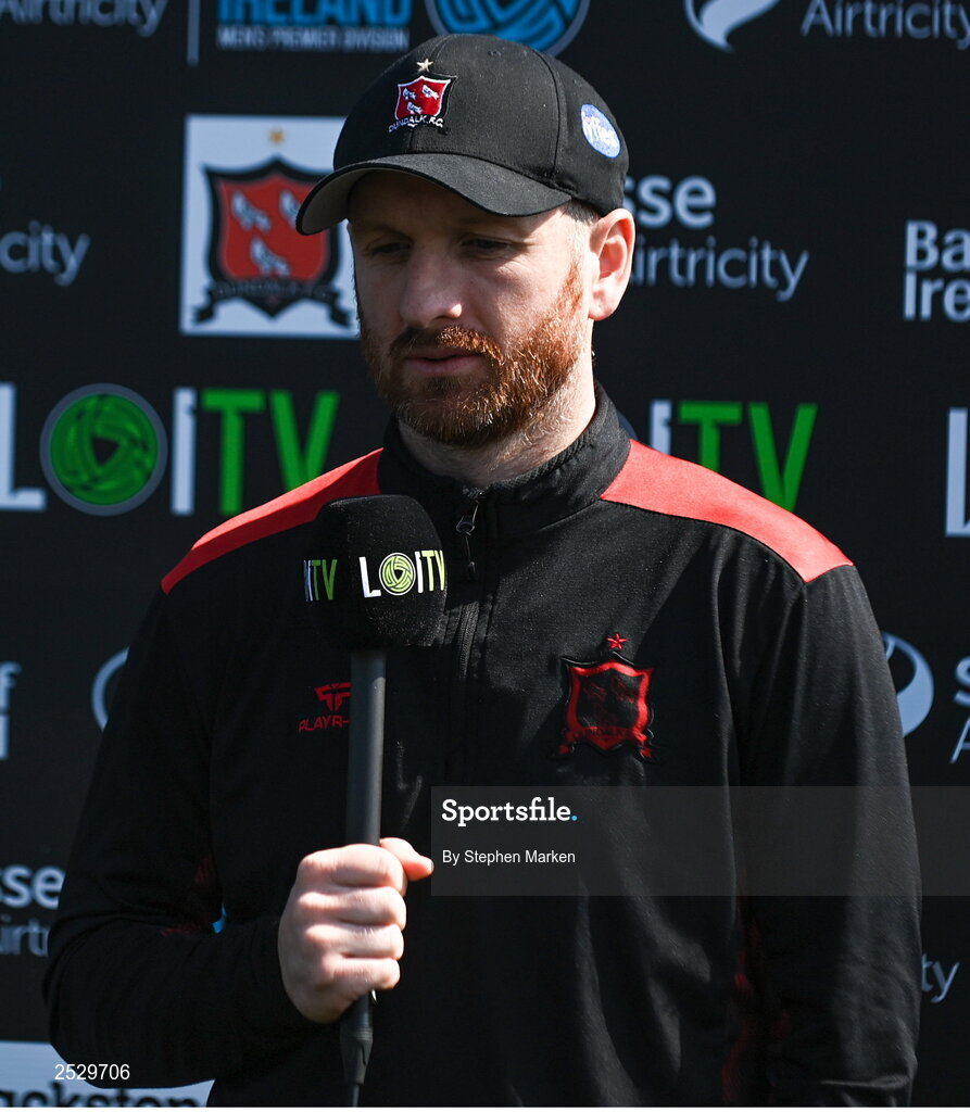 5 June 2023; Dundalk head coach Stephen O'Donnell speaks to LOI TV before the SSE Airtricity Men's Premier Division match between Dundalk and UCD at Oriel Park in Dundalk, Louth. Photo by Stephen Marken/Sportsfile