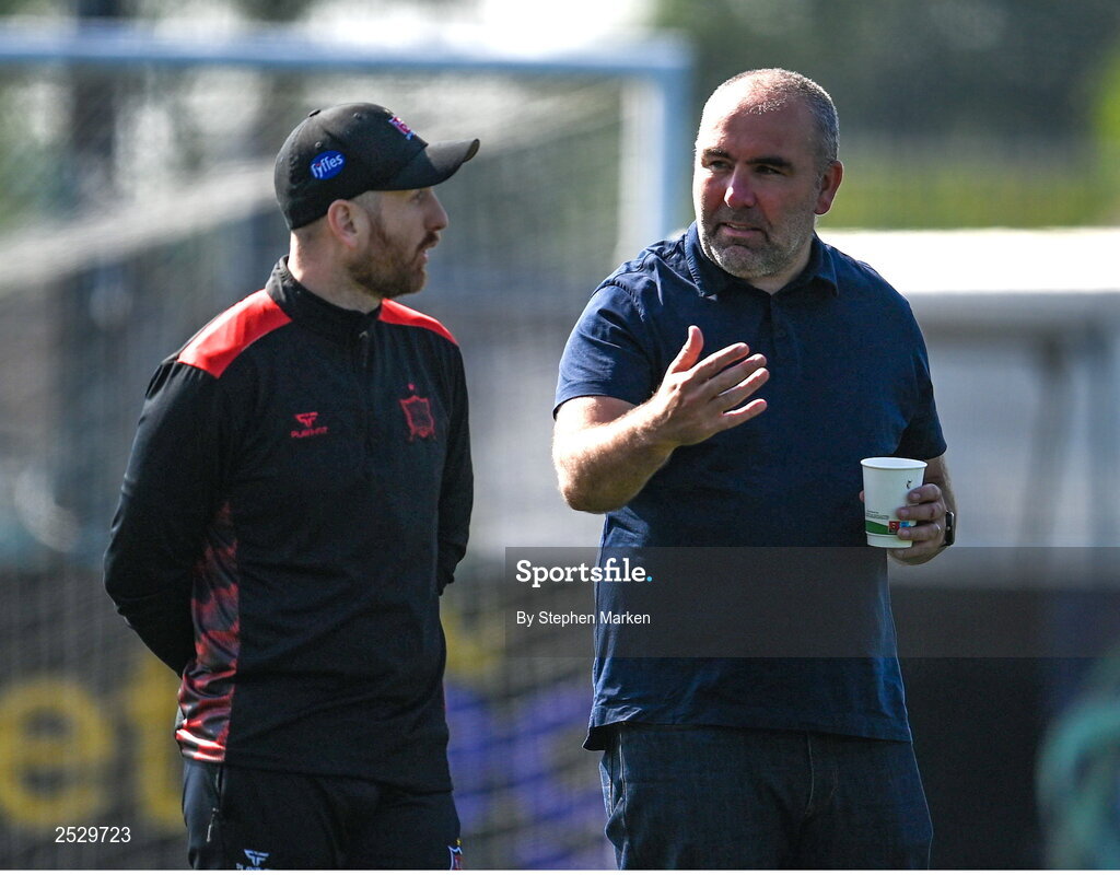 5 June 2023; Dundalk head coach Stephen O'Donnell speaks to UCD manager Andy Myler before the SSE Airtricity Men's Premier Division match between Dundalk and UCD at Oriel Park in Dundalk, Louth. Photo by Stephen Marken/Sportsfile