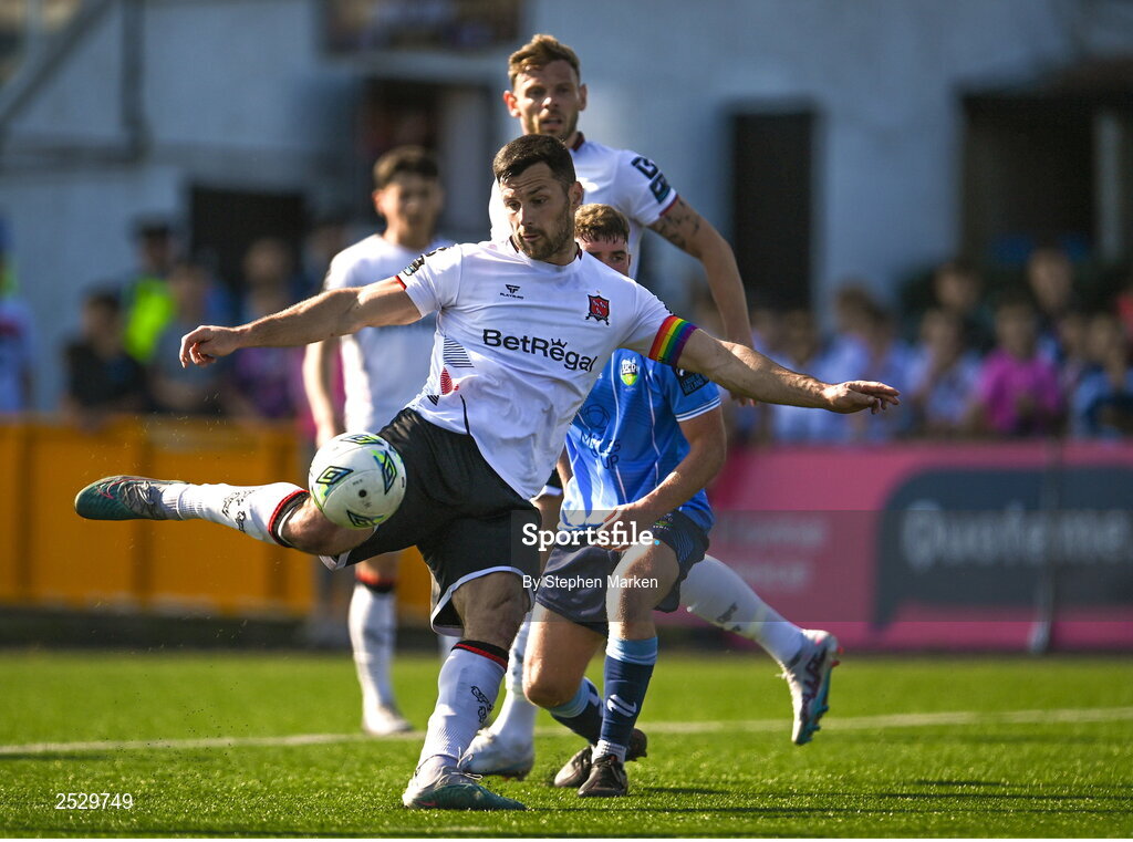 5 June 2023; Patrick Hoban of Dundalk takes a shot during the SSE Airtricity Men's Premier Division match between Dundalk and UCD at Oriel Park in Dundalk, Louth. Photo by Stephen Marken/Sportsfile