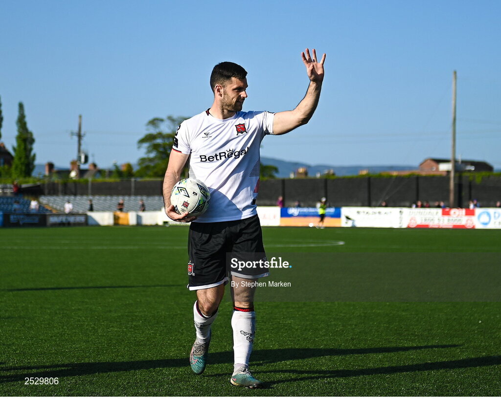 5 June 2023; Patrick Hoban of Dundalk celebrates with the match ball after scoring a hat-trick and becoming the club record goal scorer after the SSE Airtricity Men's Premier Division match between Dundalk and UCD at Oriel Park in Dundalk, Louth. Photo by Stephen Marken/Sportsfile