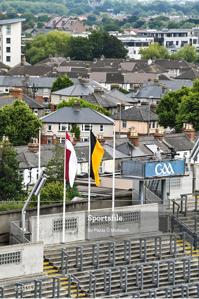 11 June 2023; A general view of Galway and Kilkenny flags inside the ground before the Leinster GAA Hurling Championship Final match between Kilkenny and Galway at Croke Park in Dublin. Photo by Piaras Ó Mídheach/Sportsfile