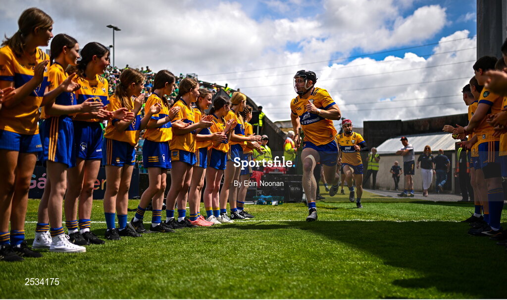 11 June 2023; Tony Kelly of Clare leads his side out the pitch before the Munster GAA Hurling Championship Final match between Clare and Limerick at TUS Gaelic Grounds in Limerick. Photo by Eóin Noonan/Sportsfile