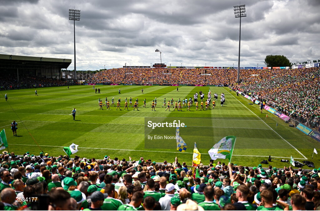 11 June 2023; Players from both teams march behind the band before the Munster GAA Hurling Championship Final match between Clare and Limerick at TUS Gaelic Grounds in Limerick. Photo by Eóin Noonan/Sportsfile