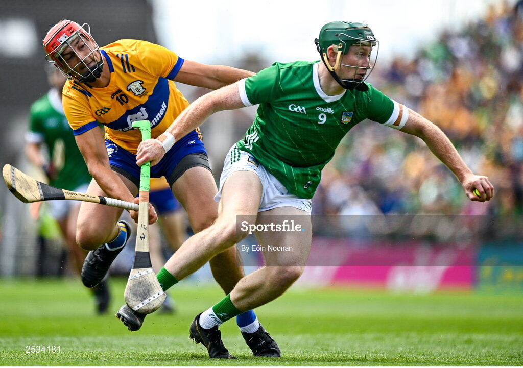 11 June 2023; William O'Donoghue of Limerick in action against Peter Duggan of Clare during the Munster GAA Hurling Championship Final match between Clare and Limerick at TUS Gaelic Grounds in Limerick. Photo by Eóin Noonan/Sportsfile