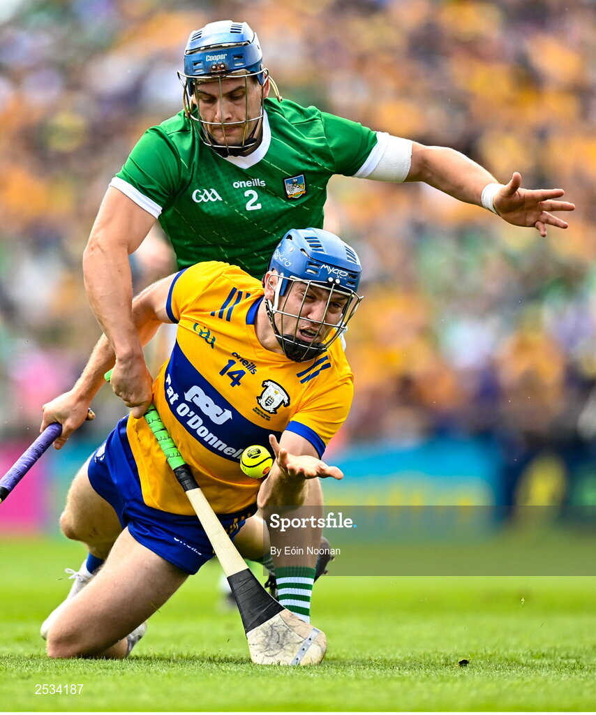 11 June 2023; Shane O'Donnell of Clare is tackled by Michael Casey of Limerick during the Munster GAA Hurling Championship Final match between Clare and Limerick at TUS Gaelic Grounds in Limerick. Photo by Eóin Noonan/Sportsfile