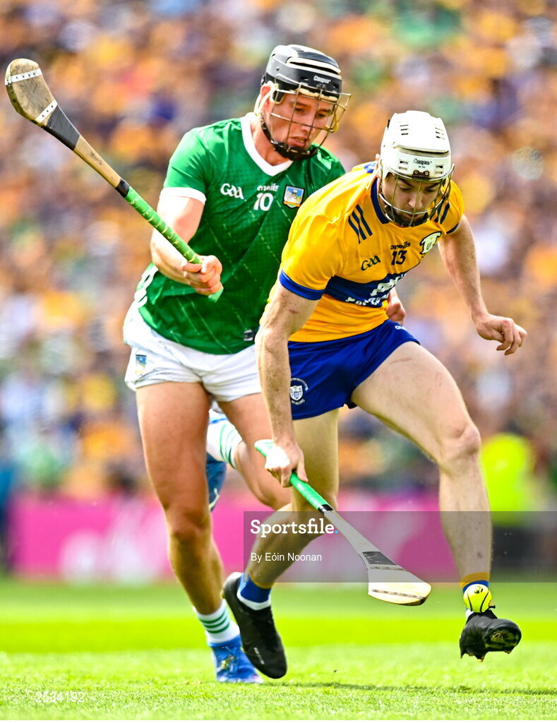 11 June 2023; Ryan Taylor of Clare in action against Gearoid Hegarty of Limerick during the Munster GAA Hurling Championship Final match between Clare and Limerick at TUS Gaelic Grounds in Limerick. Photo by Eóin Noonan/Sportsfile