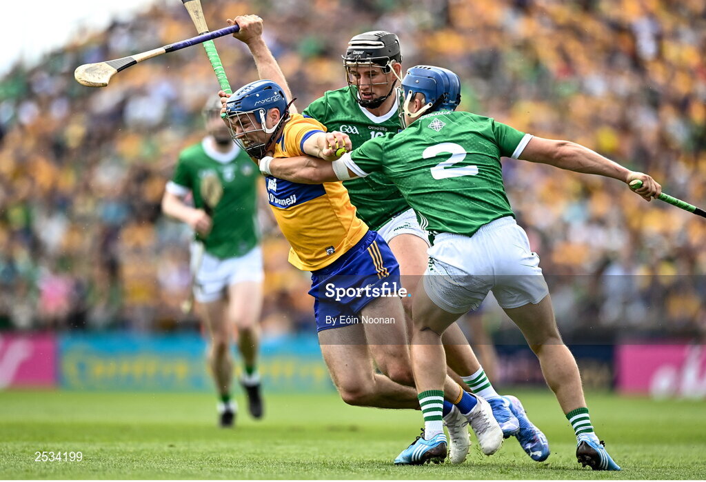 11 June 2023; Mark Rodgers of Clare is tackled by Gearoid Hegarty , left, and Michael Casey of Limerick during the Munster GAA Hurling Championship Final match between Clare and Limerick at TUS Gaelic Grounds in Limerick. Photo by Eóin Noonan/Sportsfile