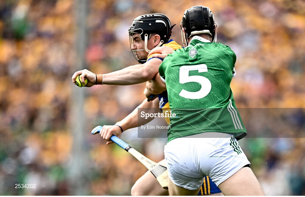 11 June 2023; Tony Kelly of Clare is tackled by Diarmaid Byrnes of Limerick during the Munster GAA Hurling Championship Final match between Clare and Limerick at TUS Gaelic Grounds in Limerick. Photo by Eóin Noonan/Sportsfile