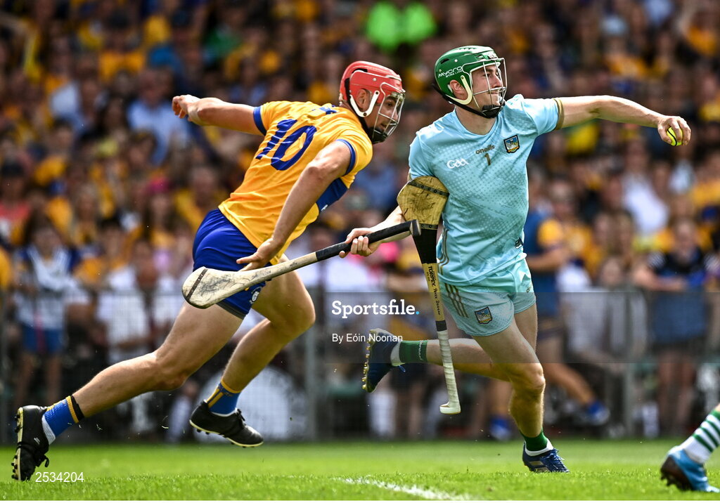 11 June 2023; Limerick goalkeeper Nickie Quaid is tackled by Peter Duggan of Clare during the Munster GAA Hurling Championship Final match between Clare and Limerick at TUS Gaelic Grounds in Limerick. Photo by Eóin Noonan/Sportsfile