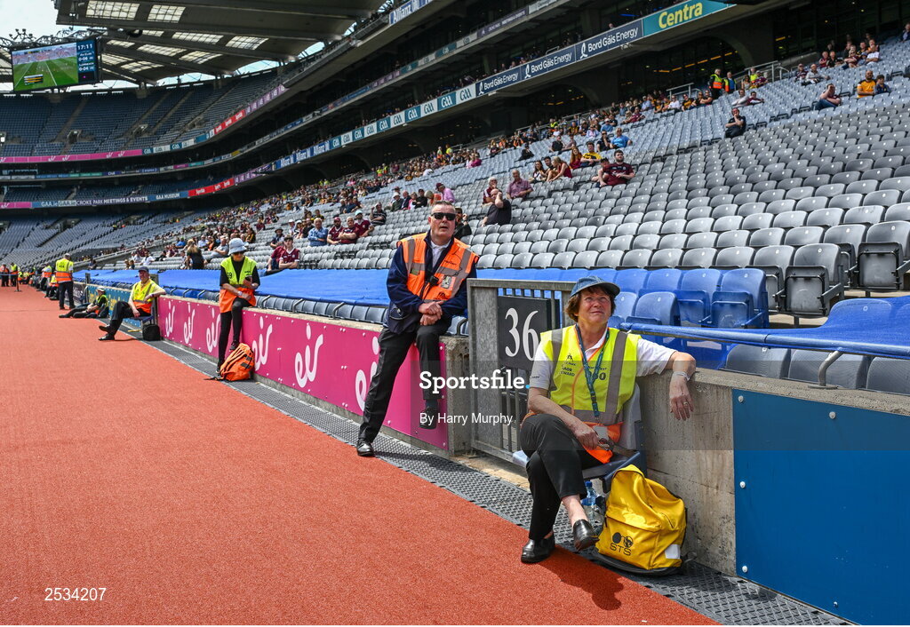 11 June 2023; Stewards watch the Munster SHC final on the big screen before the Leinster GAA Hurling GAA Championship Final match between Kilkenny and Galway at Croke Park in Dublin. Photo by Harry Murphy/Sportsfile