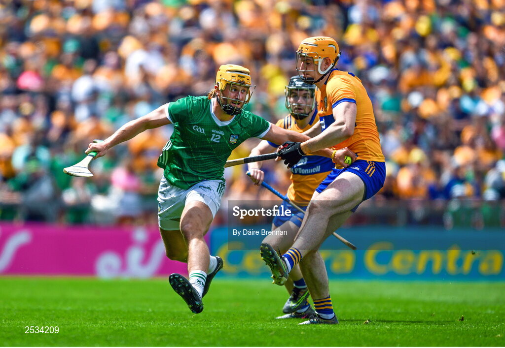 11 June 2023; Tom Morrissey of Limerick in action against David Fitzgerald of Clare during the Munster GAA Hurling Championship Final match between Clare and Limerick at TUS Gaelic Grounds in Limerick. Photo by Daire Brennan/Sportsfile