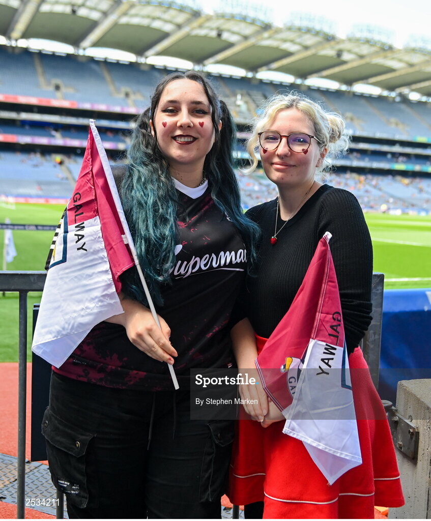 11 June 2023; Valeria and Larissa Wisner from Zug, Switzerland, before the Leinster GAA Hurling Senior Championship Final match between Kilkenny and Galway at Croke Park in Dublin. Photo by Stephen Marken/Sportsfile
