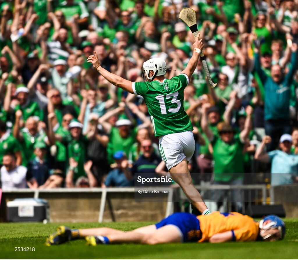 11 June 2023; Aaron Gillane of Limerick celebrates after scoring his side's first goal during the Munster GAA Hurling Championship Final match between Clare and Limerick at TUS Gaelic Grounds in Limerick. Photo by Daire Brennan/Sportsfile