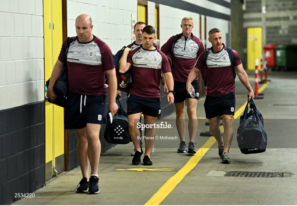 11 June 2023; Galway manager Henry Shefflin, second from right, arrives with members of his backroom team before the Leinster GAA Hurling Championship Final match between Kilkenny and Galway at Croke Park in Dublin. Photo by Piaras Ó Mídheach/Sportsfile