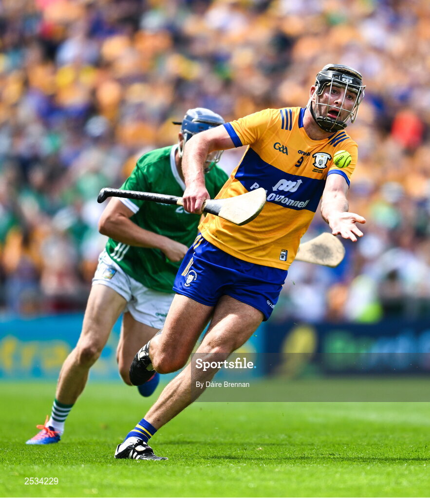 11 June 2023; Cathal Malone of Clare in action against David Reidy of Limerick during the Munster GAA Hurling Championship Final match between Clare and Limerick at TUS Gaelic Grounds in Limerick. Photo by Daire Brennan/Sportsfile