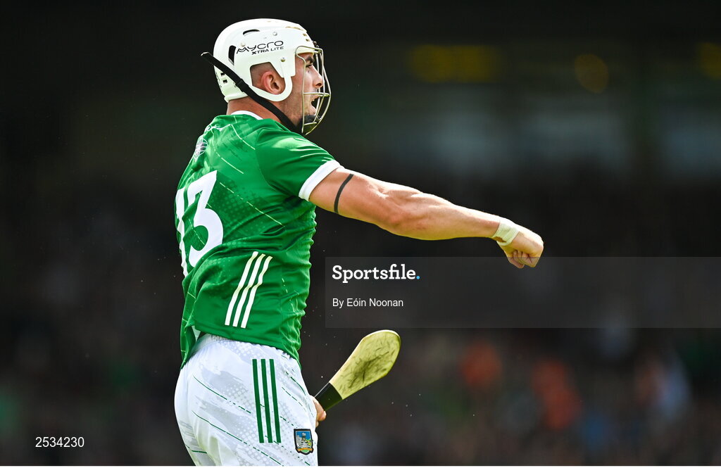 11 June 2023; Aaron Gillane of Limerick celebrates after scoring his side's first goal during the Munster GAA Hurling Championship Final match between Clare and Limerick at TUS Gaelic Grounds in Limerick. Photo by Eóin Noonan/Sportsfile