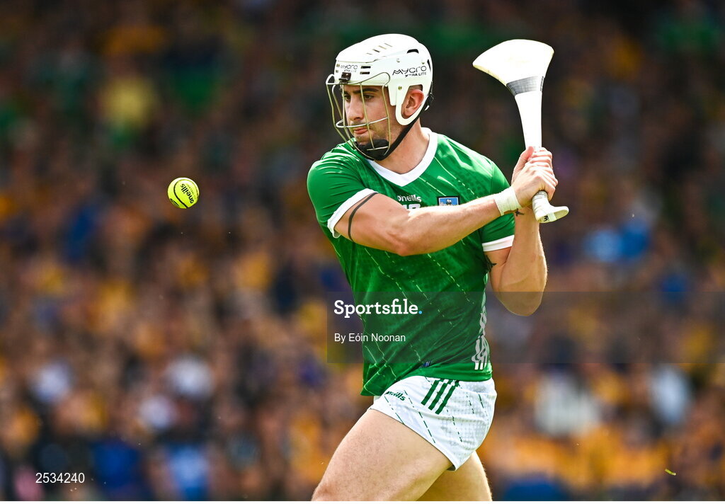 11 June 2023; Aaron Gillane of Limerick shoots to score his side's first goal during the Munster GAA Hurling GAA Championship Final match between Clare and Limerick at TUS Gaelic Grounds in Limerick. Photo by Eóin Noonan/Sportsfile