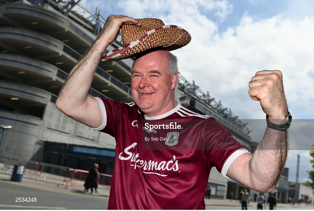 11 June 2023; Galway supporter Sean 'The Kilcolgan Cowboy' Lane, from Kilcolgan, Galway, before the Leinster GAA Hurling Championship Final match between Kilkenny and Galway at Croke Park in Dublin. Photo by Seb Daly/Sportsfile