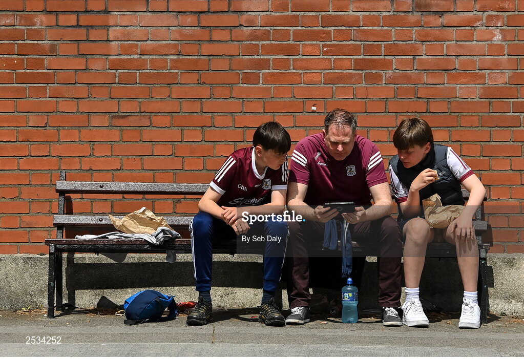 11 June 2023; Galway supporters the Moran family, from left, Oisin, Cathal, and Owen, from Portumna, Galway, watch the Munster Senior Hurling Championship Final match on a mobile phone before the Leinster GAA Hurling Championship Final match between Kilkenny and Galway at Croke Park in Dublin. Photo by Seb Daly/Sportsfile