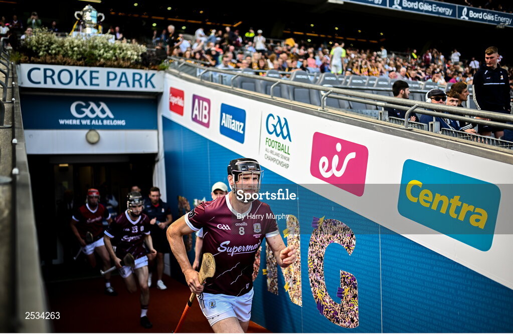 11 June 2023; Joseph Cooney of Galway runs out before the Leinster GAA Hurling Senior Championship Final match between Kilkenny and Galway at Croke Park in Dublin. Photo by Harry Murphy/Sportsfile